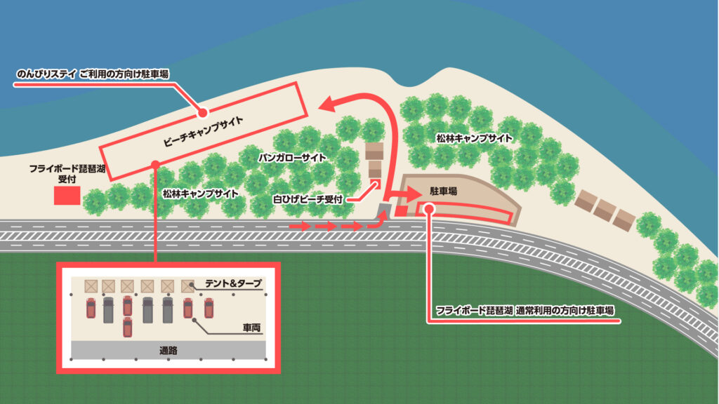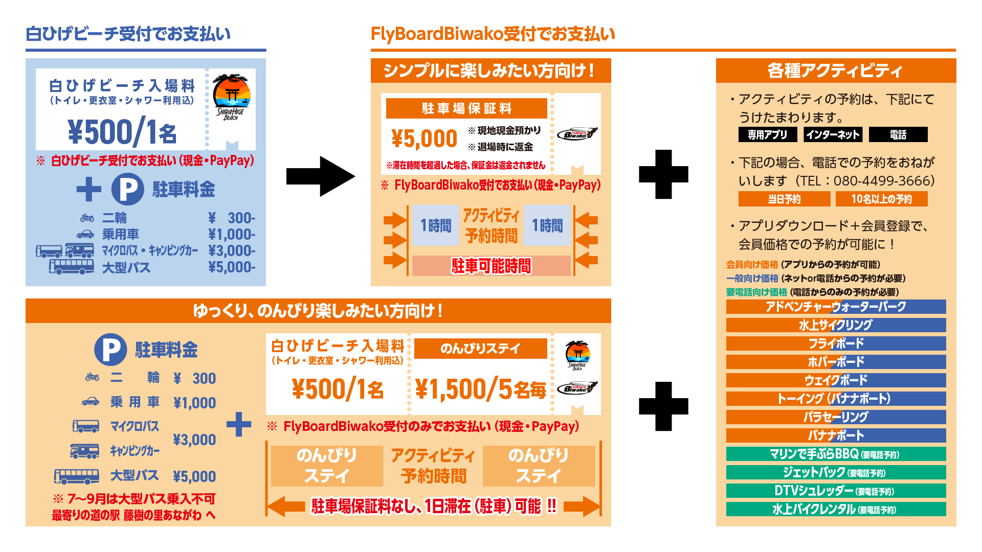 フライボード琵琶湖は、白ひげビーチ内にあるアクティビティ施設です。入場にはまず白ひげビーチ受付で入場料と駐車場料金を支払い、その後にフライボード琵琶湖の受付で駐車場保証料と各種アクティビティの受付、料金のお支払いをお願いします。