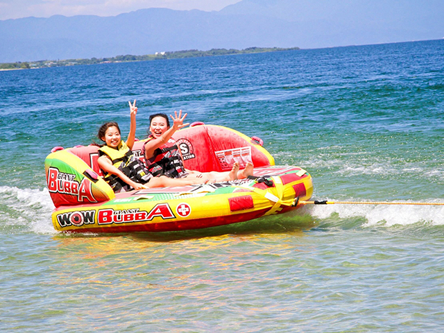 フライボード琵琶湖は、滋賀県高島市の白ひげビーチ内にある、BBQをはじめフライボードからバナナボート、ウォーターパークまで体験できるアウトドア&マリンアクティビティ施設です。