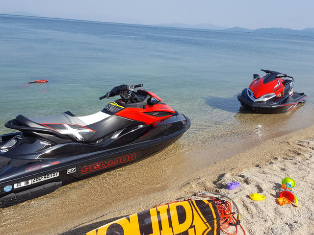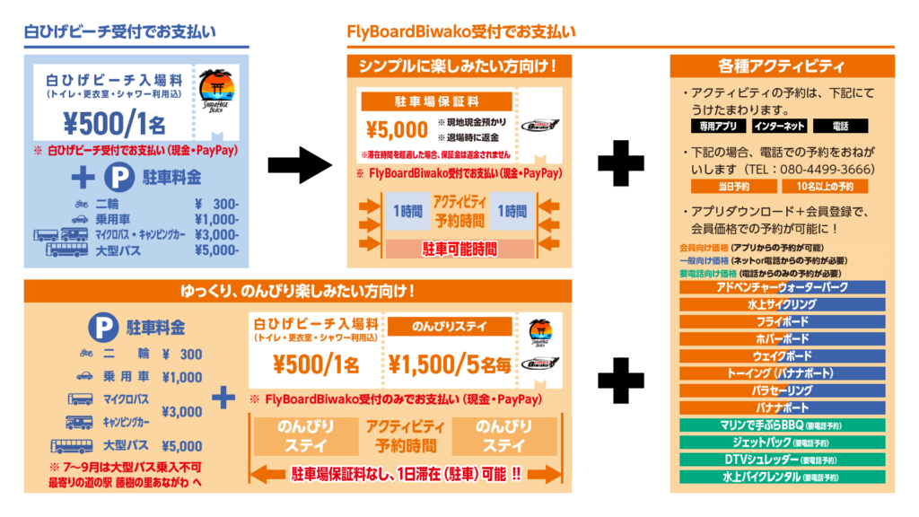フライボード琵琶湖は、白ひげビーチ内にあるアクティビティ施設です。入場にはまず白ひげビーチ受付で入場料と駐車場料金を支払い、その後にフライボード琵琶湖の受付で駐車場保証料と各種アクティビティの受付、料金のお支払いをお願いします。
